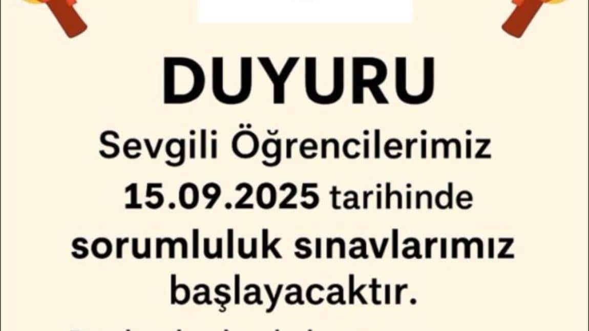2025-2026 EĞİTİM-ÖĞRETİM YILI EYLÜL AYI SORUMLULUK SINAVLARISorumluluk sınavlarımız 2025-2026 Eğitim Öğretim Yılı Eylül...